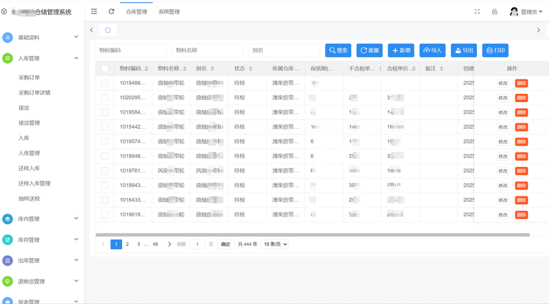 基础资料:商品管理、仓库管理、库位管理、物料类型、供方管理、客户管理。
