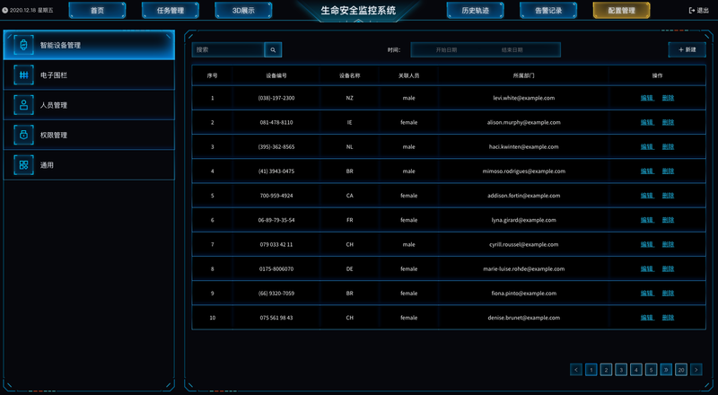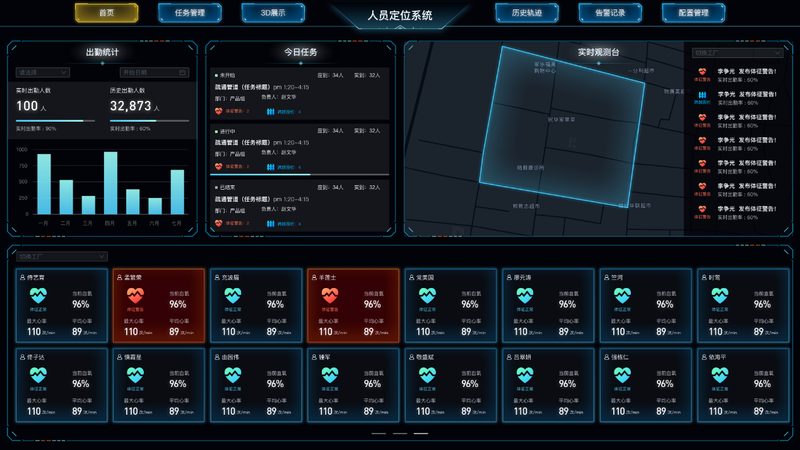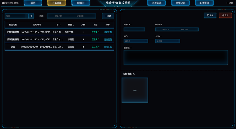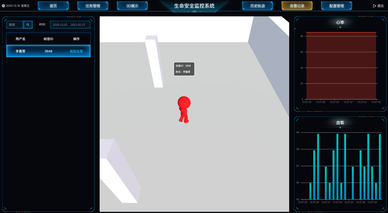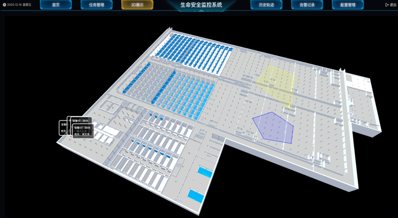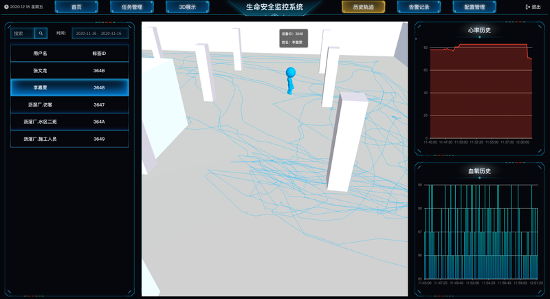 3、数据分析平台是整个人员定位系统的核心。该系统分信息监护,任务管理,3D展示,历史轨迹,告警记录,配置管理等模块。同时数据分析平台和即时通讯系统在任务管理模块和人员轨迹是互相联动的。