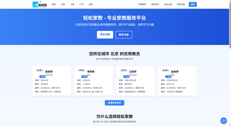 轻松家教是一个专注于K12教育领域的家教服务平台,致力于解决"找家教难、选老师难、教学效果难保障"的行业痛点。平台连接学生/家长与优质教师,提供线上一对一教学、上门教学等服务,打造安全、可靠、高效的家教服务平台。