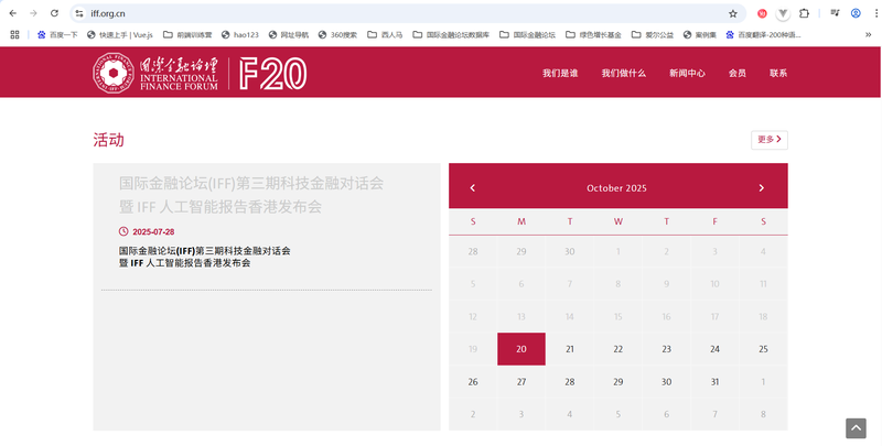 国际金融论坛(IFF)是非营利、非官方独立国际组织,2003年10月由G20国家以及联合国、世界银行、国际货币基金组织等相关机构及领导人共同发起成立,是全球金融领域高级别常设对话机制和多边合作机构,被誉为全球金融领域的“F20(Finance 20)”。