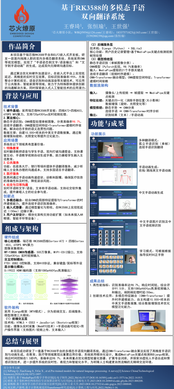 本项目是一款基于RK3588嵌入式平台与Django框架的多模态手语双向翻译系统,具备以下核心功能模块: