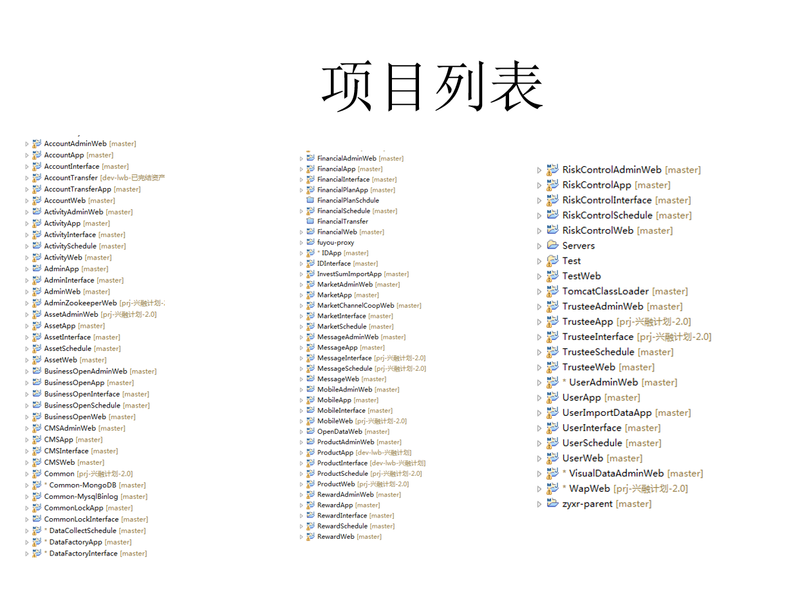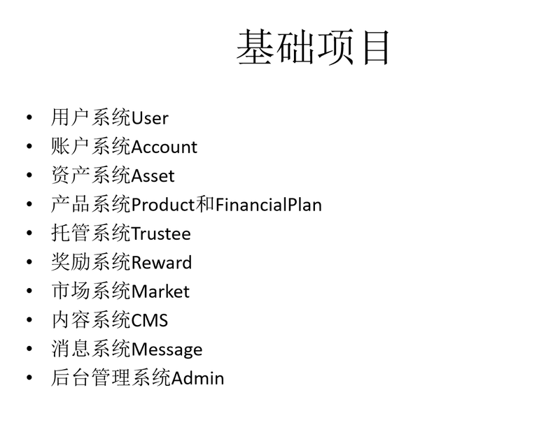 资产管理,菜单管理,会员体系,定时任务,投资模块(兴业智选),文件模块,用户系统,账户系统,产品系统,托管系统,奖励系统,市场系统,消息系统,后台管理系统,活动系统,开发平台(拎包游),分控系统,数据可视化,理财师系统