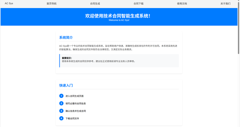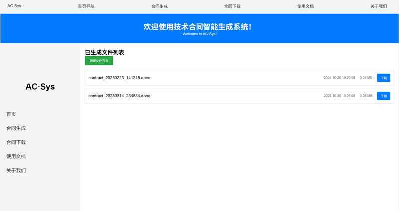 系统采用响应式前端设计,支持合同数据的完整生命周期管理,从信息录入、智能生成到文件下载的全流程自动化处理,为技术合同创建提供高效便捷的解决方案。