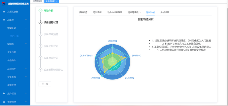 4:智能分析:通过物联网传感器采集设备运行信息融合设备台账数据信息、设备点检数据信息、设备维修保养信息,构建运行模型自学习系统,基于设备运行参数,一键智能分析设备相关指标,人机交互简单便捷友好。点击开始分析按钮,依次展示核心设备关键指标及设备保养预警信息,设备使用状况评估、设备保养评估、设备维修验证评估。