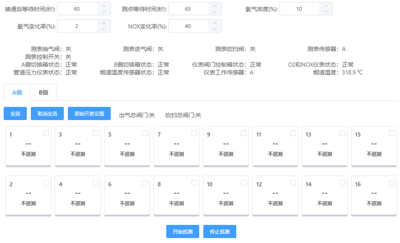 具有远程控制、自动测量、自动记录、自动分析、计算喷氨建议值和输出自动调整功能。展示电厂机组的平衡性和均匀性的近期数据、曲线图等信息,具体功能包含:巡测、吹扫、定时任务、喷氨门开度调整、巡测历史等。