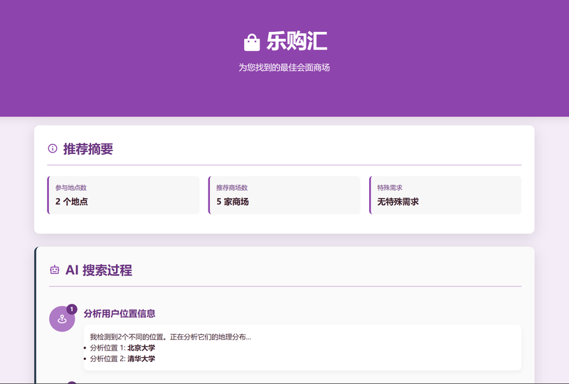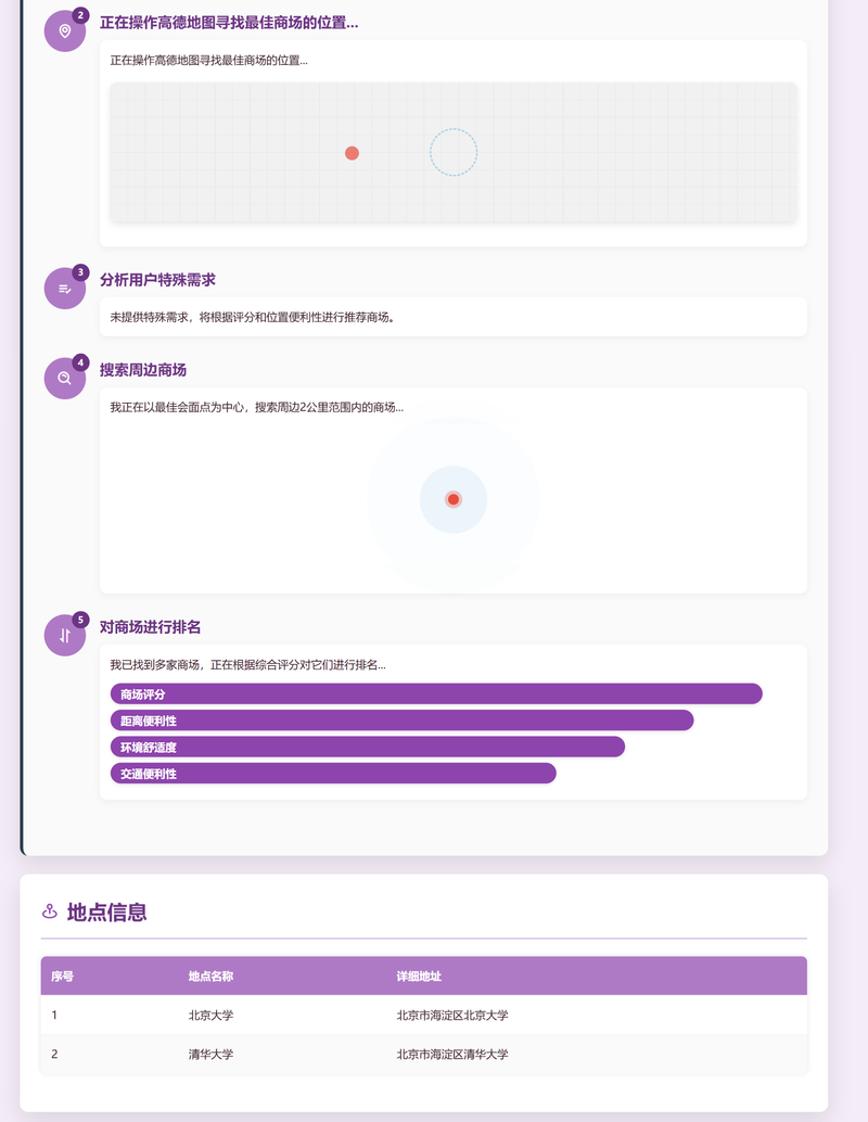 3. 多场景POI搜索 - 支持同时搜索1-3种场所类型(咖啡馆、餐厅、图书馆、商场、公园、电影院、健身房、KTV、博物馆等12种类型),搜索半径5公里,并发搜索提升性能,智能去重算法避免重复推荐。