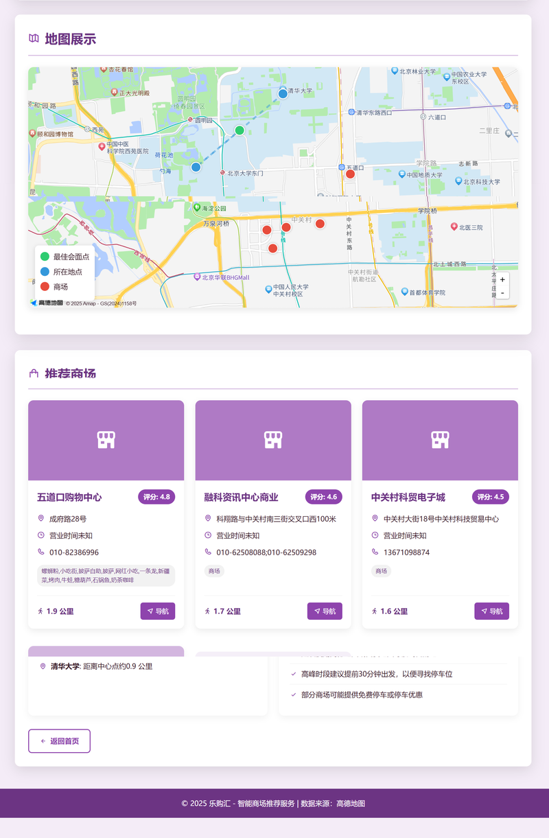 5. 可视化展示模块 - 自动生成美观的HTML推荐页面,集成高德地图展示所有位置点和推荐场所,支持路线规划和一键导航,提供评分、地址、营业时间、电话等详细信息。