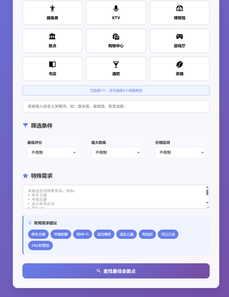 应用场景:商务会谈、朋友聚餐、学习小组、运动聚会、文化活动等多人聚会场景,帮助用户快速找到距离所有人都公平且最适合的会面地点。