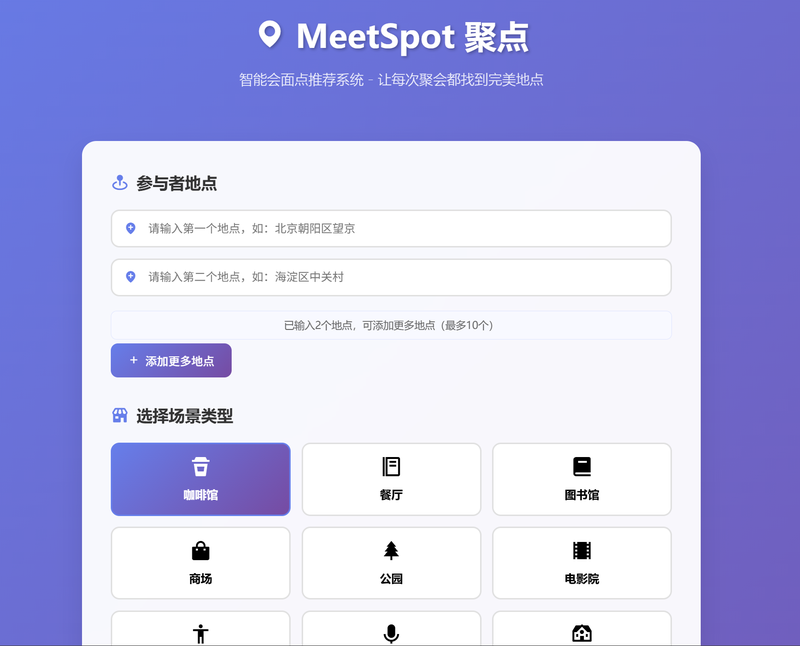 MeetSpot是一个基于地理位置的智能会面地点推荐系统,致力于解决多人聚会时寻找最佳会面场所的难题。