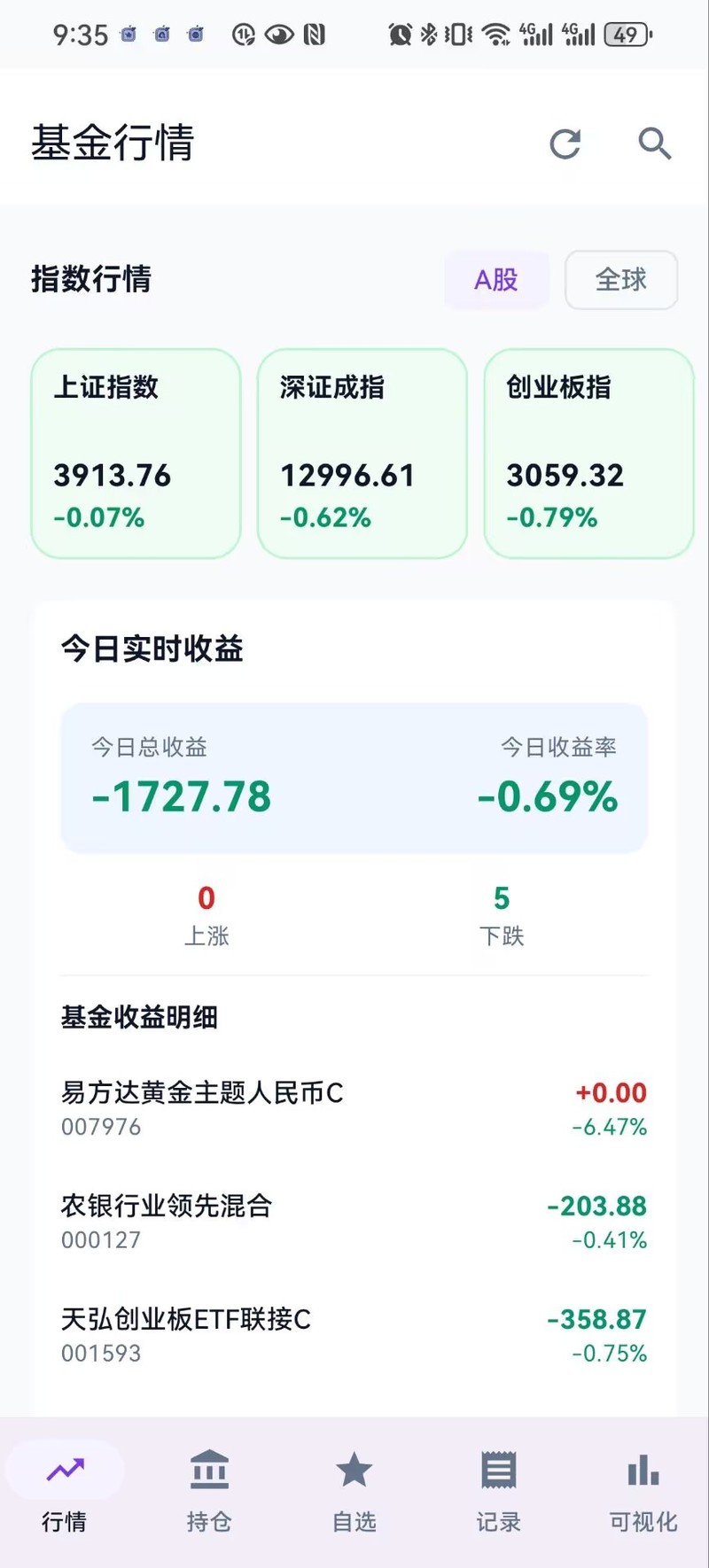 行情模块,页面顶部展示A股和全球股市的各个主要指数的实时行情,通过颜色编码快速呈现涨跌态势。创新的今日实时收益功能自动获取持仓基金的实时估值,计算当日收益金额和收益率。基金涨跌幅榜单支持日、周、月、年四个时间维度切换。搜索功能支持通过基金名称或代码快速查找,结果即时展示基本信息和最新净值。