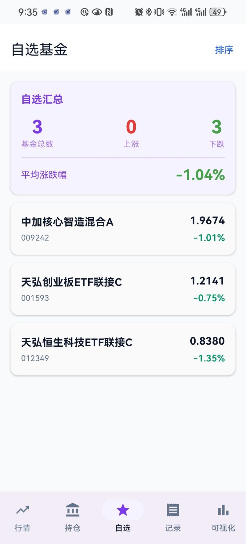 自选模块,用户可通过星标图标将基金添加到自选,列表实时展示最新净值和涨跌幅,向左滑动即可删除。该功能适合观察但未决定买入的基金,便于持续跟踪。
