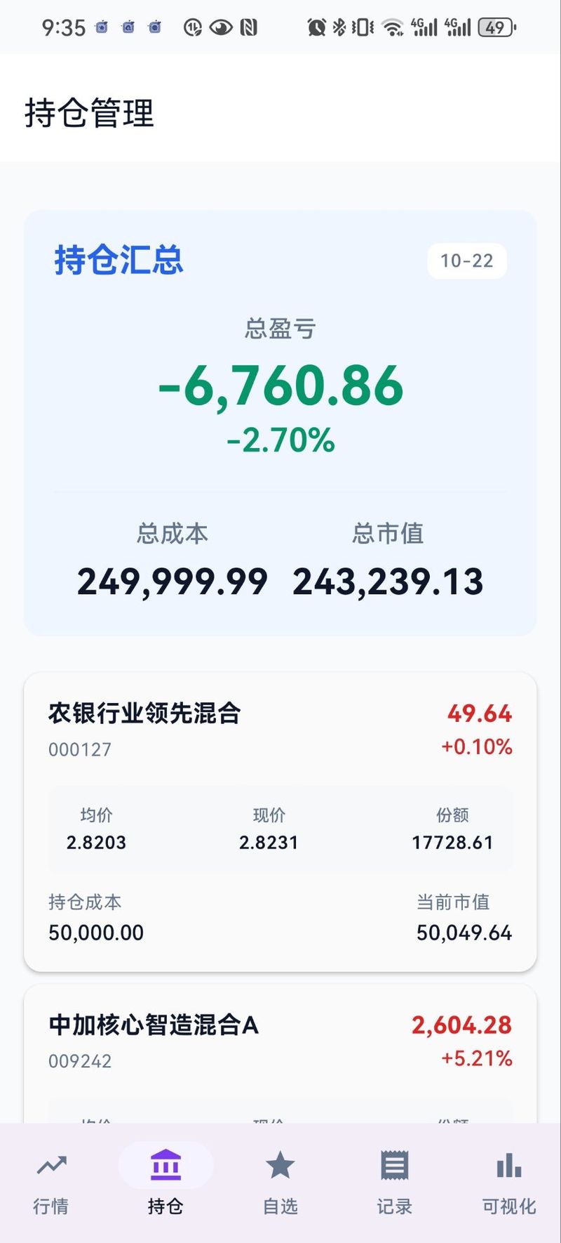 持仓管理模块解决多笔买入的复杂计算。应用自动聚合同一基金的多笔持仓,计算加权平均成本和总份额,清晰呈现真实投资成本和当前盈亏。持仓汇总卡片展示总盈亏、总成本和总市值。当日买入的基金标注"待确认"状态,避免对未确认数据的误解。卖出采用先进先出策略。