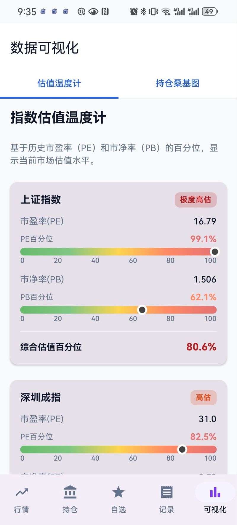 可视化模块将数据转化为直观图表。估值温度计基于历史市盈率和市净率百分位,用渐变色温度条展示市场估值水平,从绿色低估区到红色高估区,辅助用户判断买入时机。持仓桑基图以色块呈现持仓结构,色块大小代表基金占比,帮助识别资产配置是否过于集中。