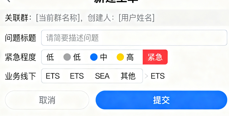2.快捷建单为核心应急场景设计的极简建单流程。系统自动预填当前群组和信息,用户仅需输入问题标题、选择紧急程度和业务线即可快速提交。