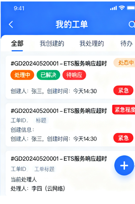 4.工单列表与视图多视图筛选:提供“我创建的”、“我处理的”、“待办的”、“全部”等不同维度的工单视图。