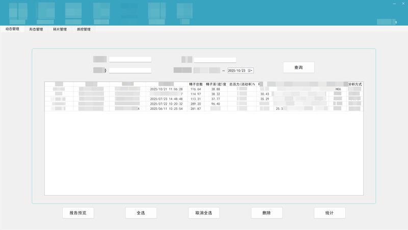项目包含动态分析、形态分析、碎片分析、质控分析、数据管理、系统设置等功能,分析功能主要对图像进行分析处理实现目标跟踪型态分析,数据管理对分析数据及基本信息管理。