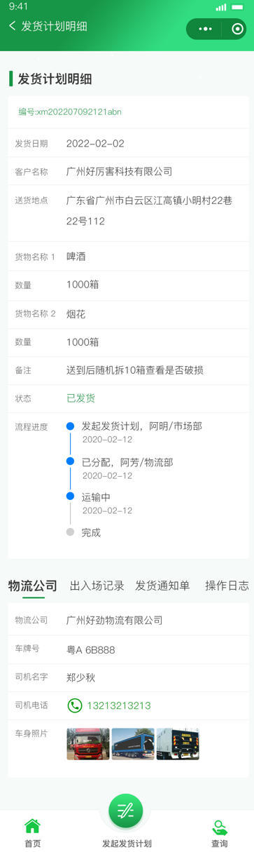 流程介绍:市场部发起发货计划、物流部分配物流公司、物流公司分配司机与车辆、系统登记司机与车辆到出入场系统,出入场系统回调车辆出厂信息给发货系统完成发货。