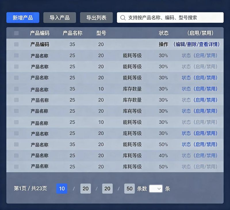 1. 产品基础管理模块:负责产品信息的增删改查,包括产品名称、型号、参数、分类、图片上传等。