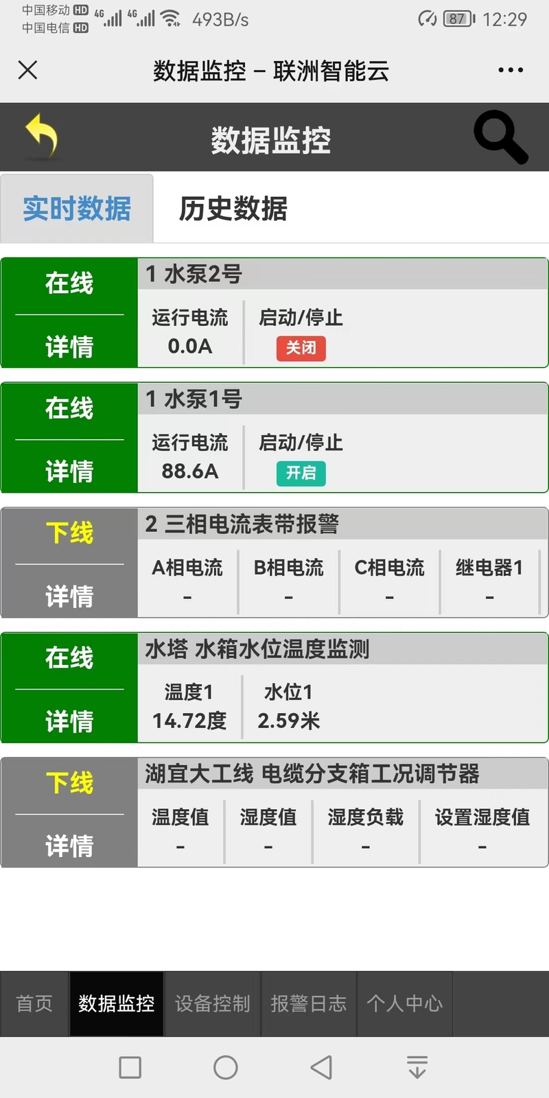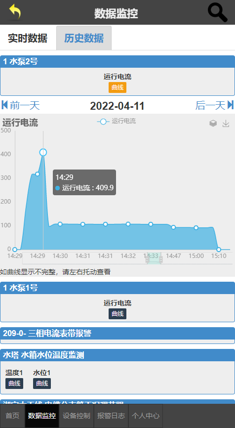 3、手机上可查看水泵启动运行时的电流曲线,电压曲线。