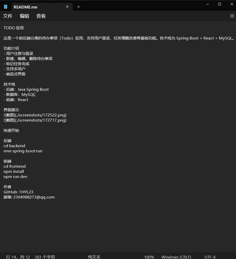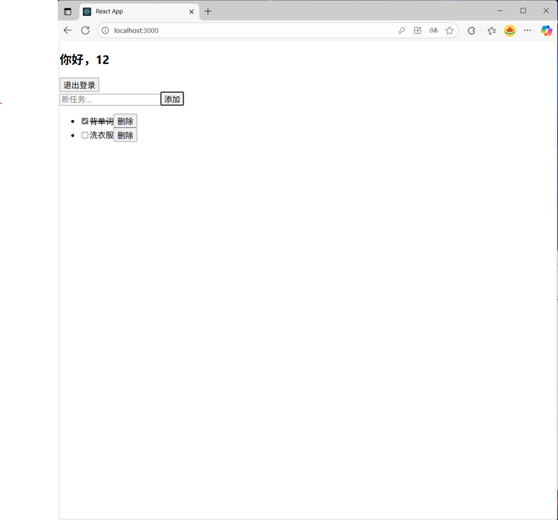 2. 项目的主要功能描述: 用户可以在React构建的动态前端界面中完成所有操作:包括账户的注册与登录、个人任务清单的创建、查询、更新与删除。整个交互过程无需刷新页面,体验流畅。前端负责渲染和用户交互,后端专注于数据处理与业务逻辑,共同构成了一个体验优良的现代化Web应用。