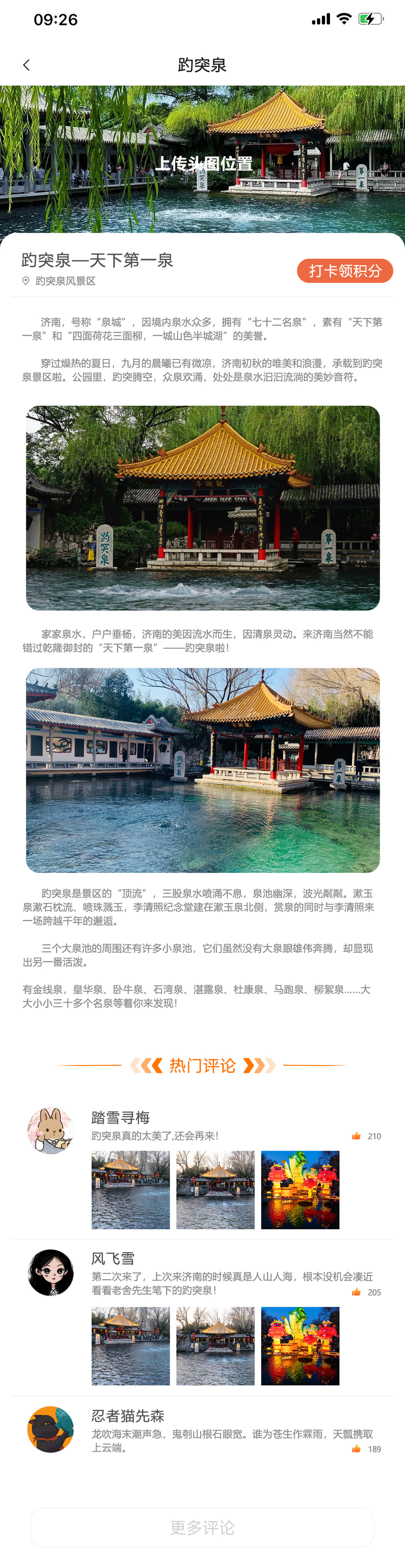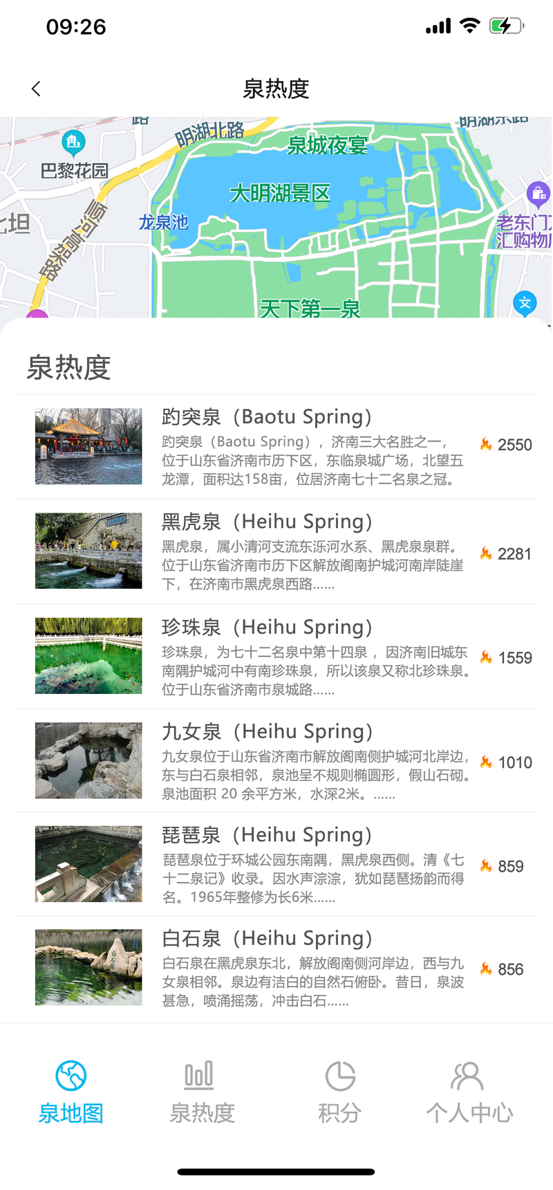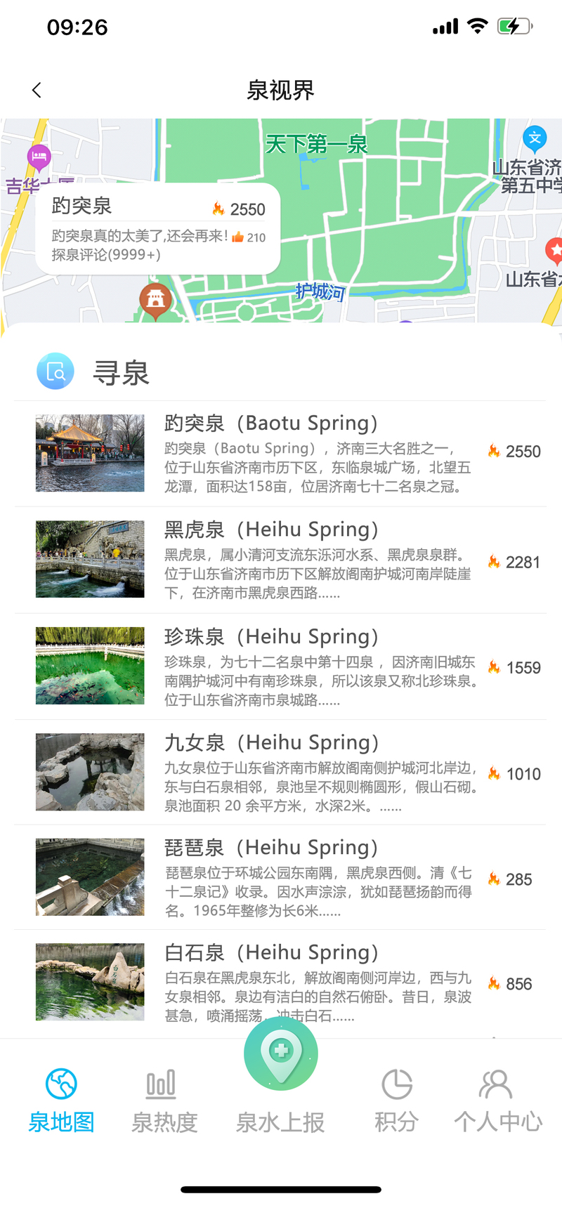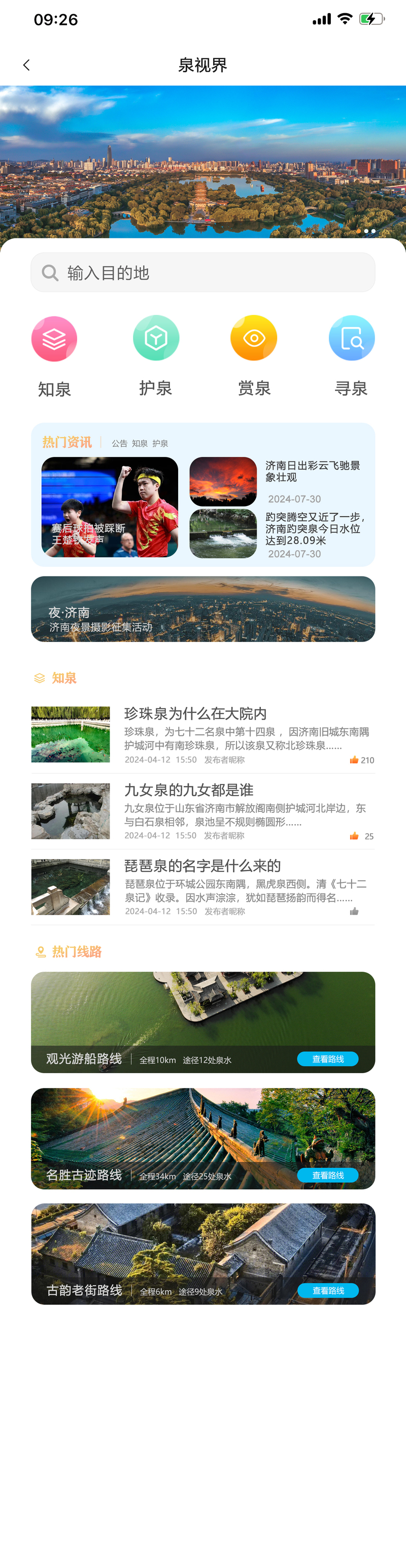 1. 展示济南名泉,提供旅游线路和打卡互动;