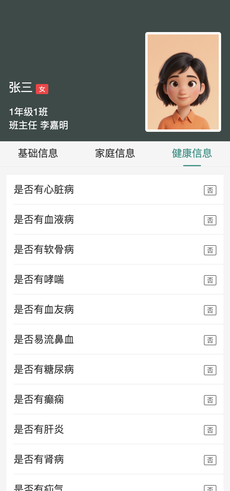 2、多类型疾病与特殊情况记录,包含基本信息、家庭信息、健康信息,支持记录四特基本情况,涵盖特殊家庭、特殊心理、特殊行为、特殊身体,使学生状况有据可查。