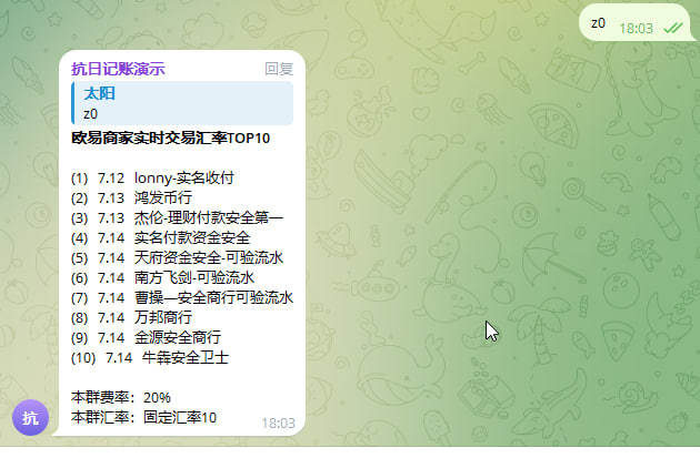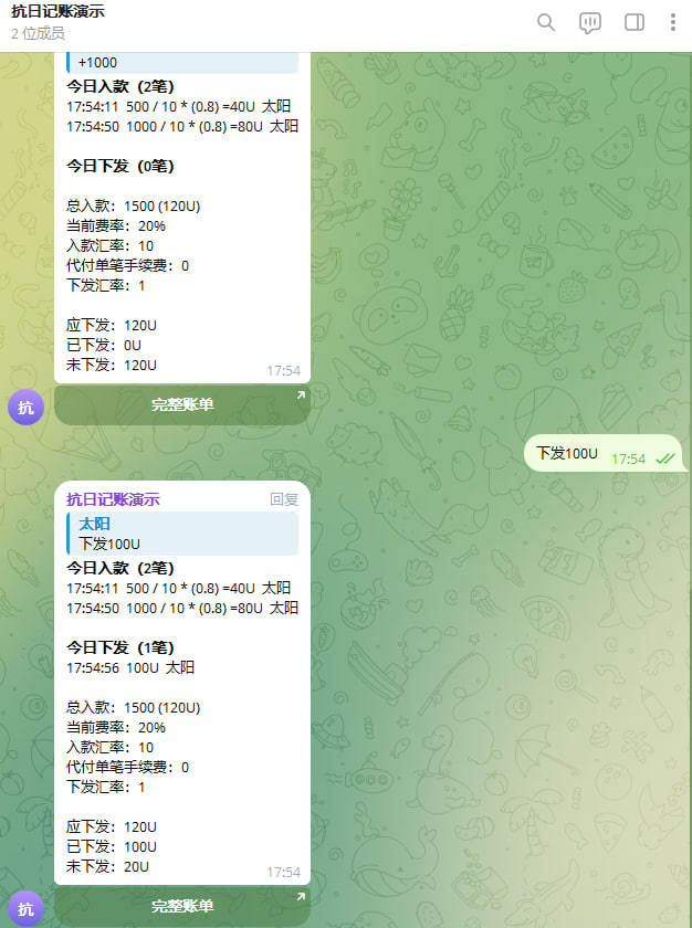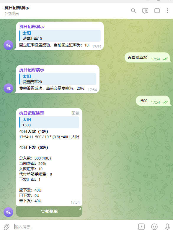 智能记账:支持入款、出款、下发,自动计算汇率。