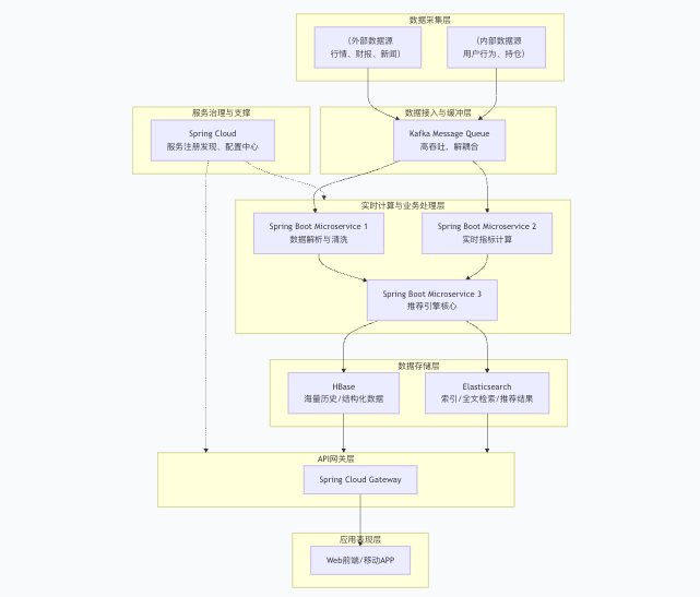 本项目采用基于Java与Spring Boot的微服务架构。数据流由Kafka接入,利用Spring集成作业进行多维度指标计算。结果持久化至HBase供历史查询,同时索引至Elasticsearch实现智能推荐与全文检索。各服务通过Spring Cloud进行治理,共同构建一个高并发、可扩展的智能推荐平台。