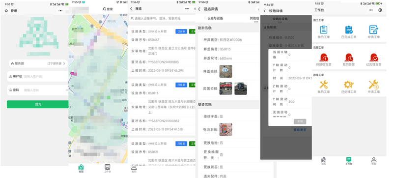 各省市管网与运营商对智能人井终端进行管理,通过地图显示设备热力图,通过web/App对系统中告警、施工、故障等信息进行通知,并支持查看整个工单处理过程。web/App通过鉴权后可对对应设备进行下发命令进行管控等操作。app在现场导航查找设备等。