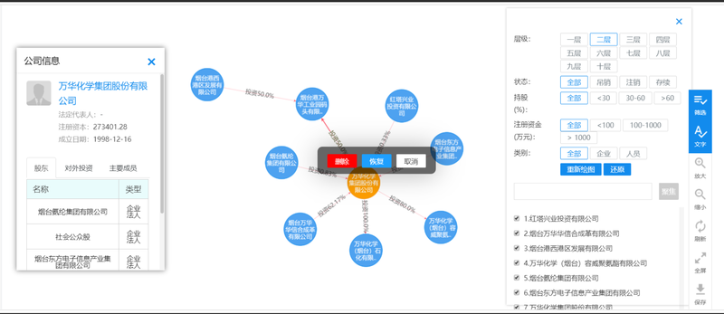关系图谱是利用图数据作为数据依据,以关系图作为可视化的展示效果,展示企业与企业、企业与自然人、自然人与自然人之间的关系,绘制成庞大的关系网络,形成企业群组,并在页面中添加交互功能如:对图中的数据进行筛选、对关系进行断开,使关系图谱更加清晰。