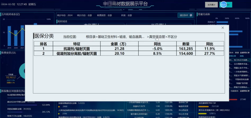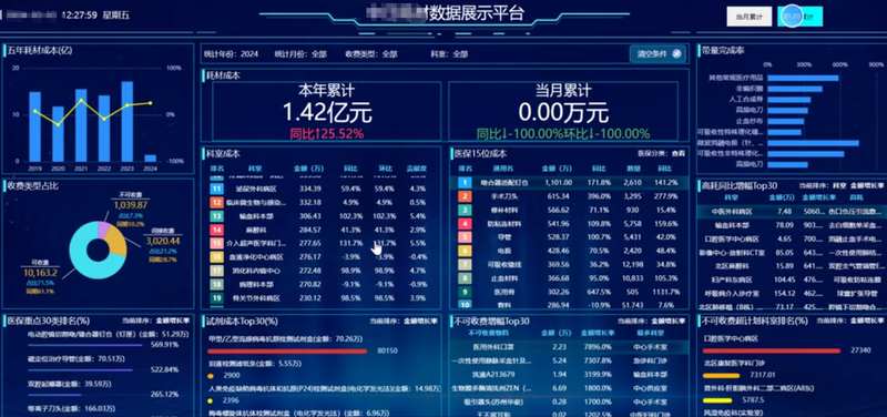 处理数据,整合图表、页面设计开发、后台逻辑开发、对系统进行稳定性测试和兼容性测试。解决图表的设计、医院逻辑数据的处理、图表响应速度等难点。根据医院SPD系统数据,创建数据大屏,帮助医院管理层清晰了解耗材使用情况,根据科室、部门、耗材各方面进行数据统筹,更加直观表现医院耗材的财务情况。,前端以echarts图表设计为主,采用钻取的方式获取更详细信息。数据库使用SQL sever