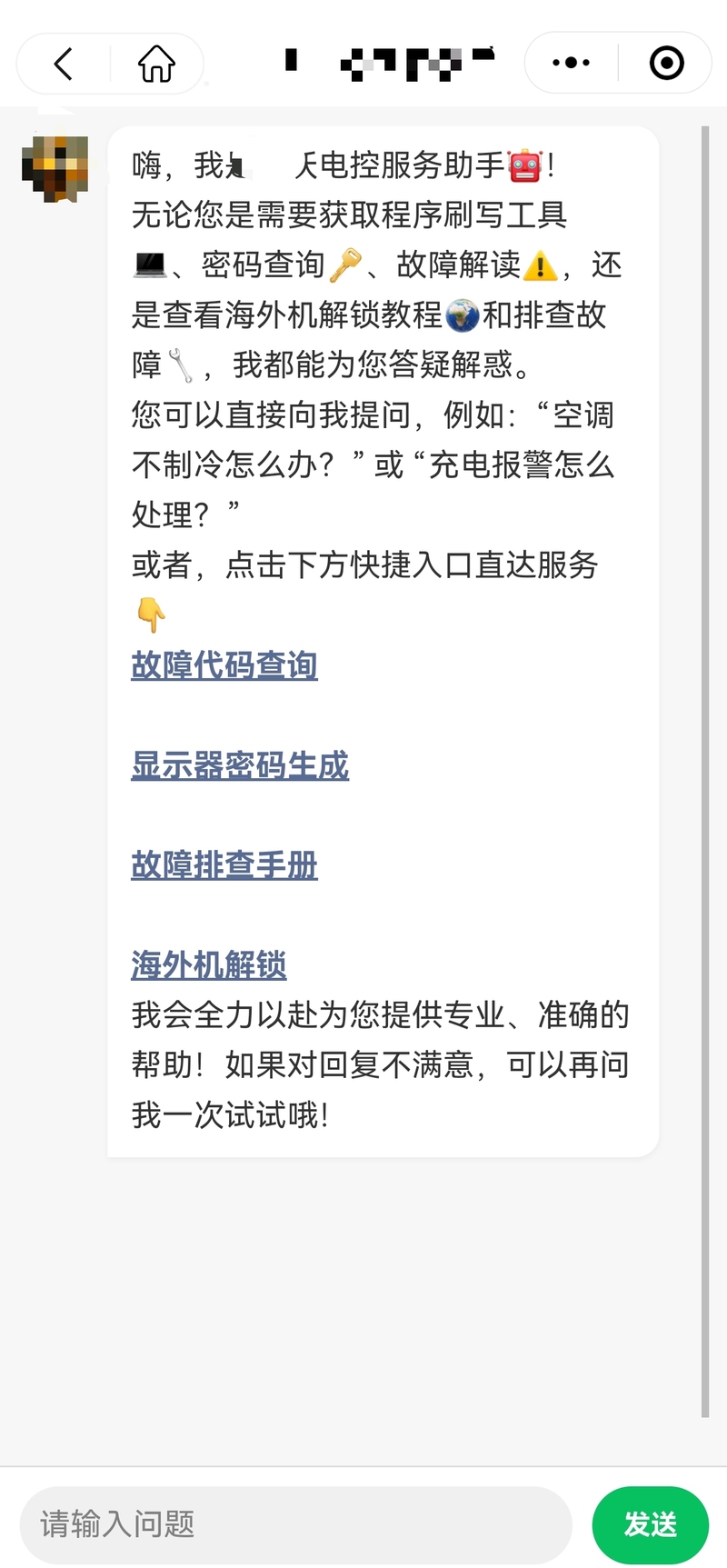 减少人力成本,客户、服务人员自主查询电控相关内容。如:动态密码生成、教程播放、故障码查询、AI智能问答等