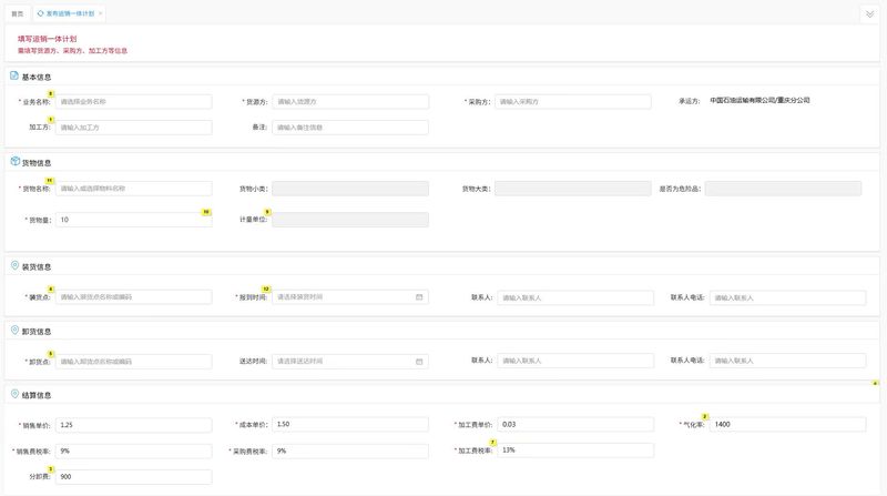 计划代提:对运销流程进行包装。(谁采购,采购谁的,采购什么,由谁配送)1)基本信息 :装货点、货源方、采购方、加工方、运输单位