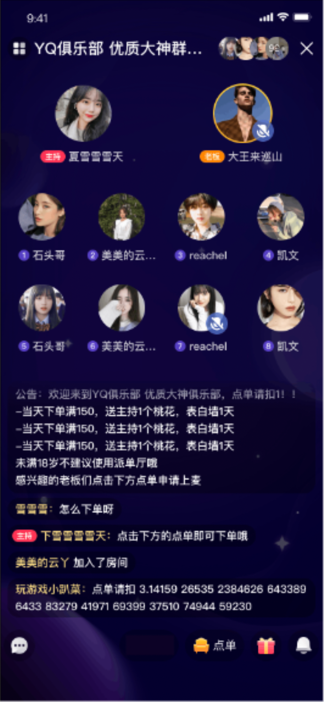 有两种形态,陪玩形态与顾客形态,根据自己的需求注册不同类型的身份,在语音房也可以进行发弹幕、送礼等