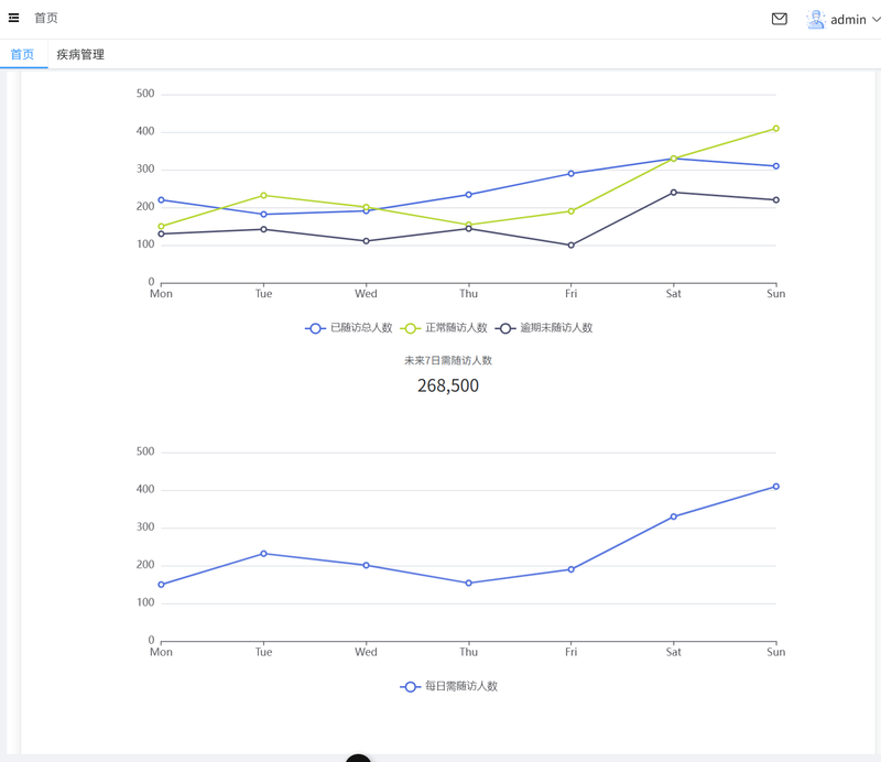 1. 首页使用了echarts功能,用图表方式展现患者消费记录及医护人员回访情况