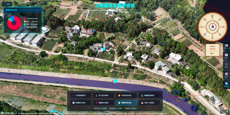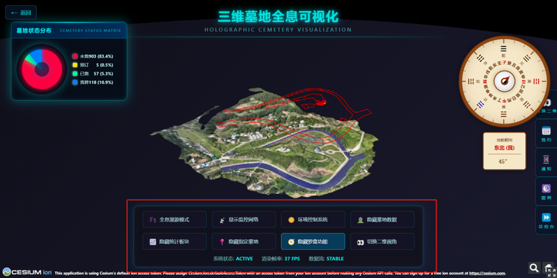 立体地图:Cesium.js渲染城市三维模型,直观展示墓位地点,地形风水等等。