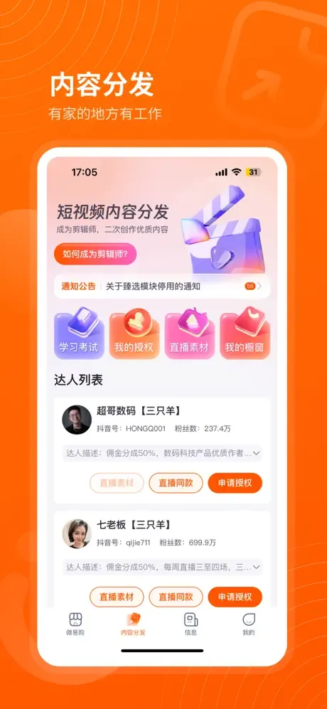 本平台致力于拓展社会灵活就业渠道,为用户提供便捷的短视频带货参与机会。用户完成APP注册授权后,即可获取公司的精选剪辑视频素材,通过抖音平台进行带货推广。订单成交并完成结算后,系统将根据预设分成比例自动计算用户收益,用户可随时将所得金额提现至个人银行卡账户,实现创作变现的闭环流程。