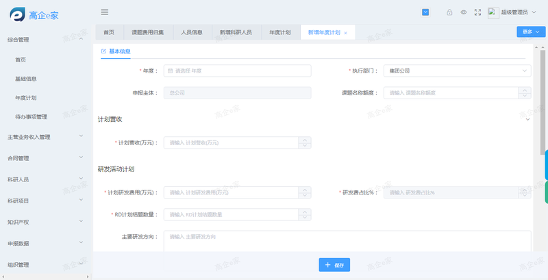 企业的内部管理软件,做研发投入管理、课题管理、研发时长、知识产权申报、技术转化管理、审计统筹、营收管理和研发投入计算、人力支援管理、分子公司管理,项目申报管理,纳税减免管理。