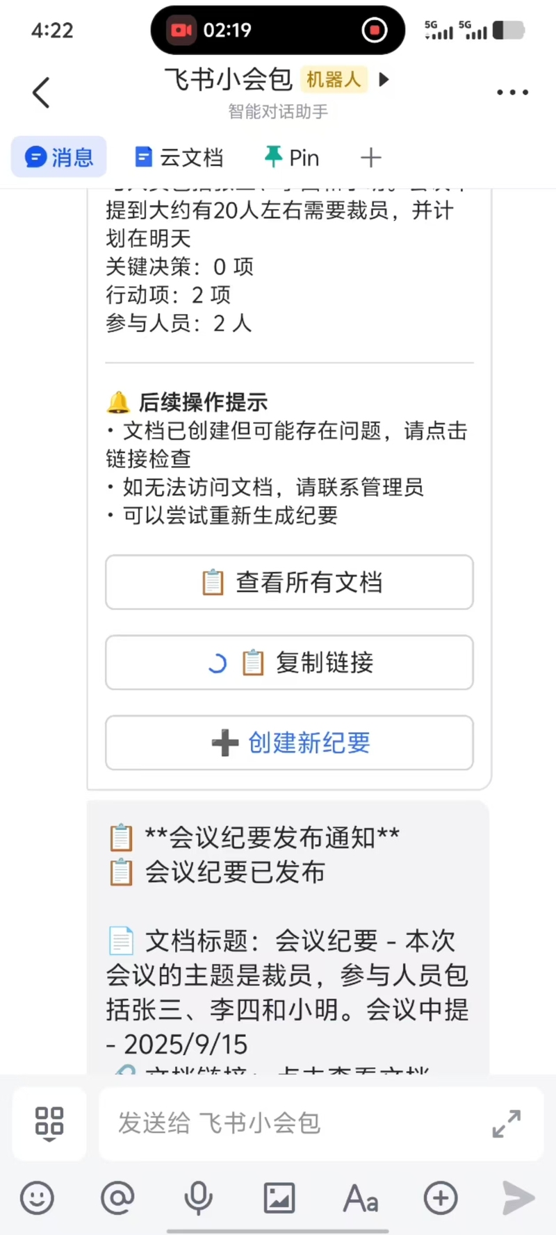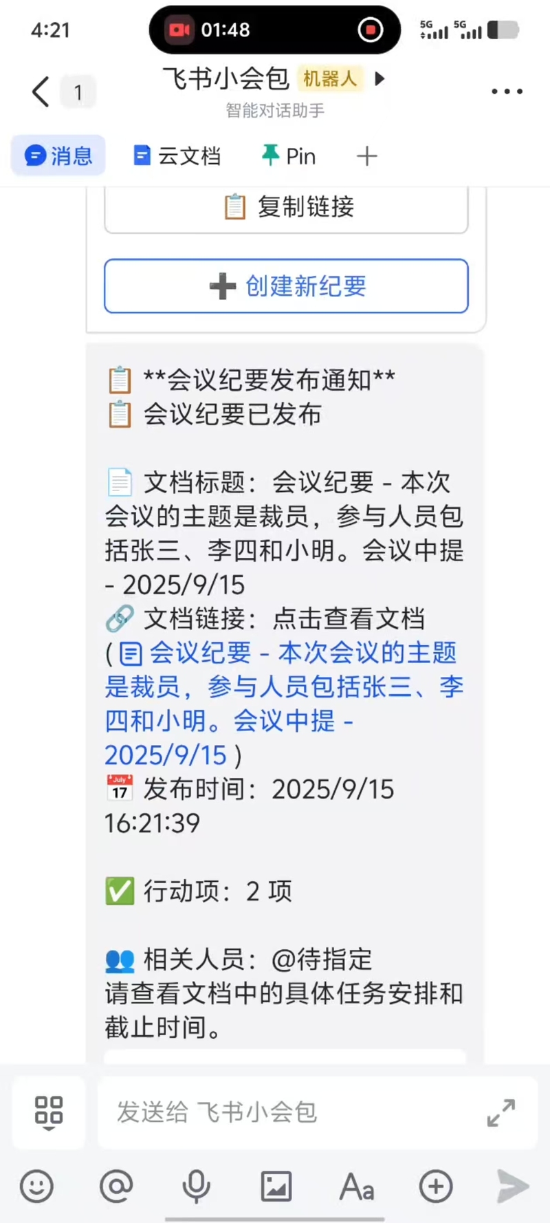 **一键"纪要"命令 → 10秒AI生成 → 结构化文档 → 群内回链归档**