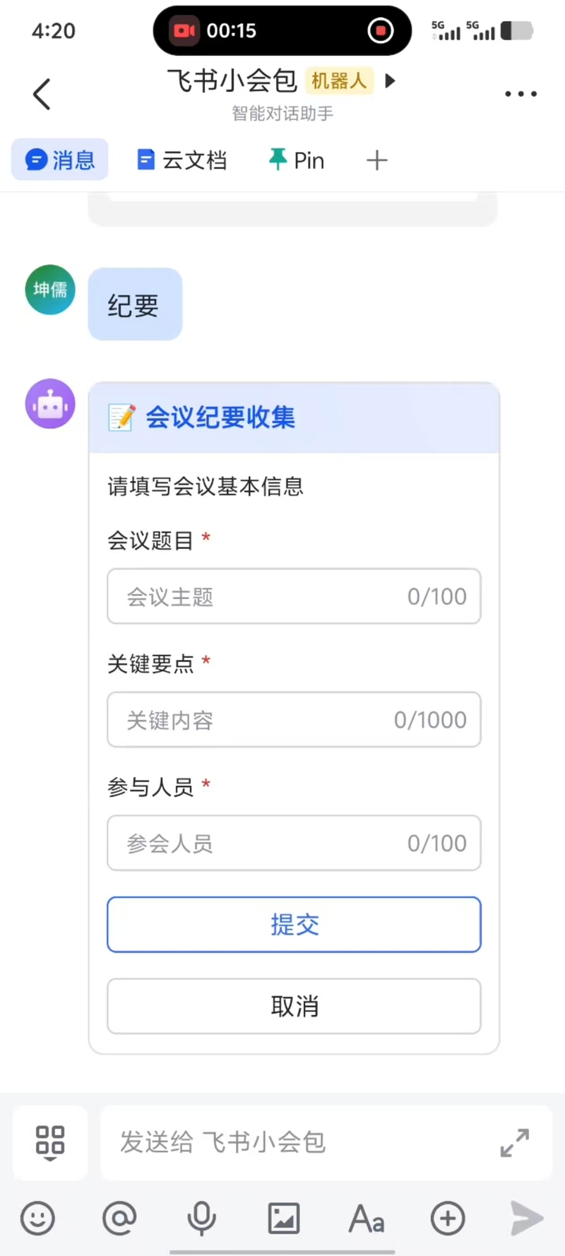 会议进行中/结束后 → 群内发送"纪要" → 填写关键要点 → AI生成草稿