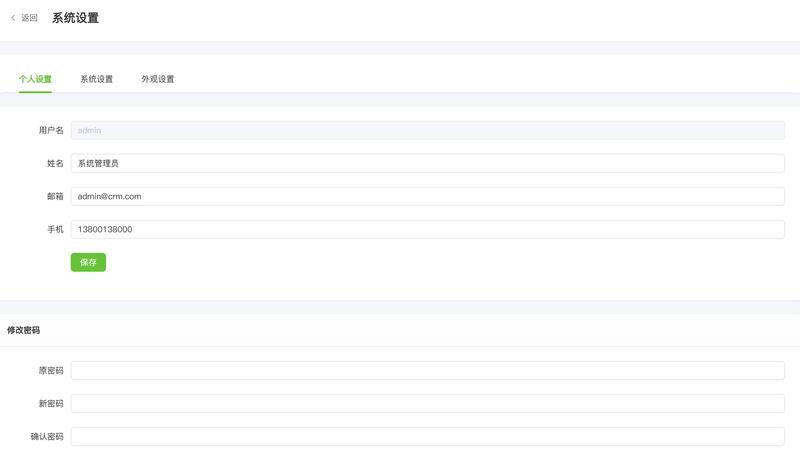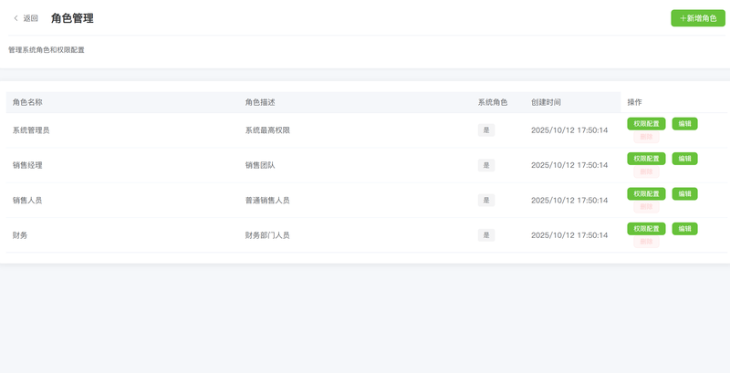 - 角色管理: 预设角色(管理员、销售经理、销售、财务等)