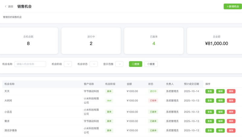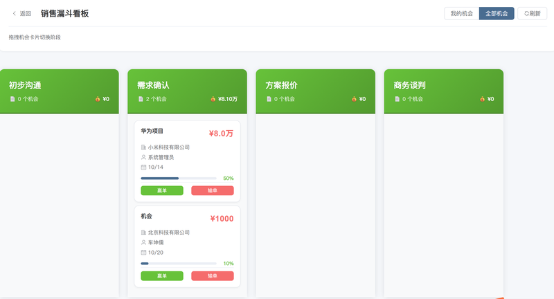 - 销售漏斗可视化,实时追踪销售机会转化进度