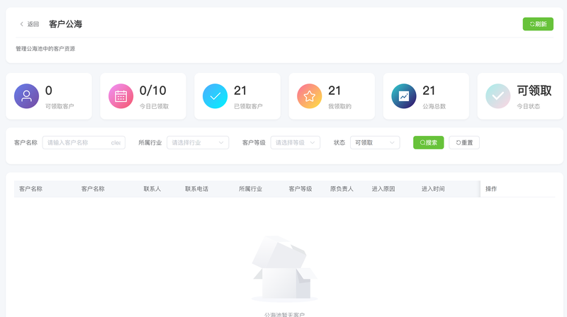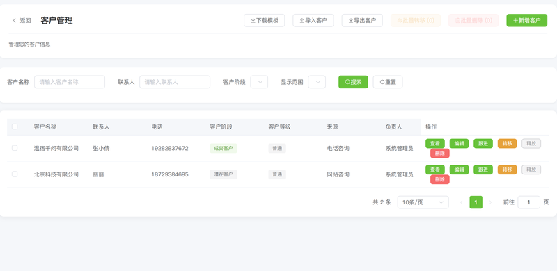 - 客户列表: 分页查询、多条件搜索、高级筛选、批量操作