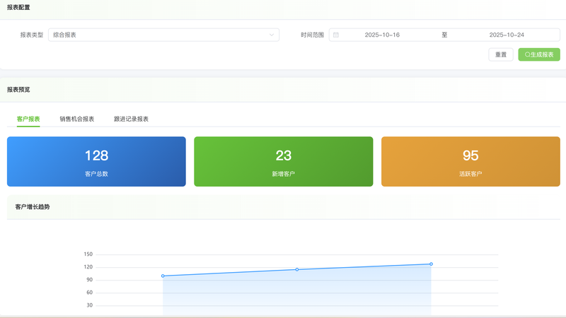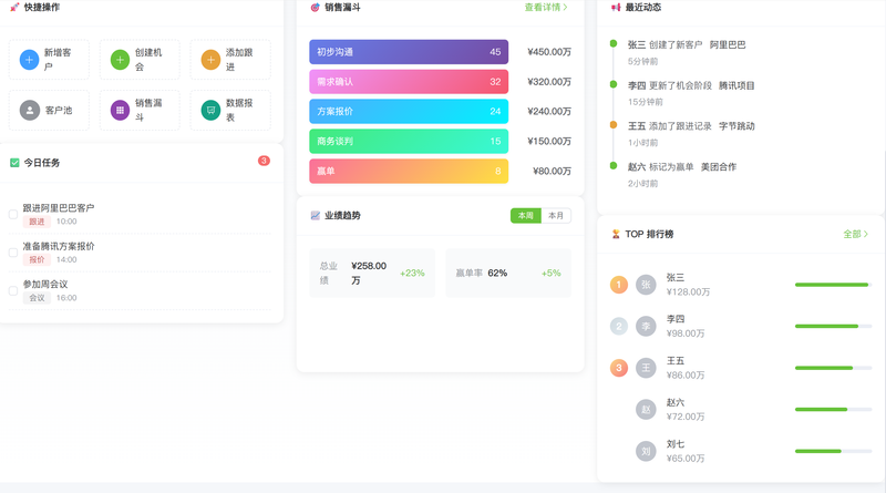 - 数据概览: 核心指标卡片(客户数、机会数、跟进数、待办数)