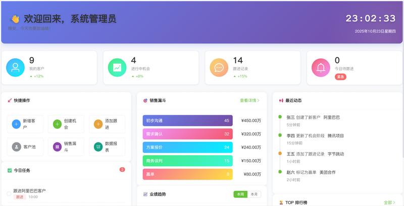 在企业数字化转型浪潮中,传统的Excel表格管理客户信息已无法满足现代销售团队的协作需求。客户信息分散、跟进记录缺失、业绩数据不透明等问题严重制约了销售效率。本项目旨在打造一套完整的CRM解决方案,实现客户全生命周期管理、销售流程可视化、数据驱动决策。