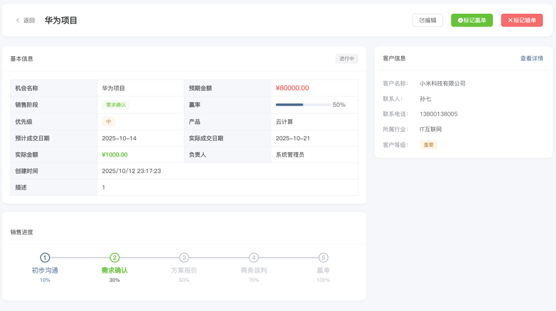 - 机会管理: 预计金额、预计成交时间、优先级标记