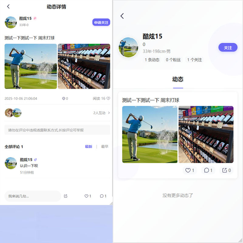 功能介绍(一)核心社交功能内容发布支持用户发布活动、群组及帖子信息,涵盖读书会、骑行、心理疗愈等多种社交场景,满足不同兴趣用户的需求。同城匹配基于地理位置信息,帮助用户快速寻找附近的活动与群组,实现精准的同城社交对接。群组互动提供群组创建与加入功能,部分群组可设置进群费用,查看群二维码需支付相应费用,同时支持群组置顶以提升曝光度。访客与关注用户可查看访客记录,关注感兴趣的用户,建立个性化的社交关系链。(二)商业运营功能会员体系设置 30 天(10 元)和 90 天(30 元)两种会员套餐,会员可享受免费发布活动与群组、免费查看用户联系方式等特权,降低社交门槛。置顶服务提供 7 天(1 元)、1 个月(3 元)、3 个月(8 元)三种内容置顶选项,帮助用户提升活动、群组或帖子的曝光量,获取更多关注。收费机制灵活设置多种收费场景,包括活动与群组的发布及参与收费、用户信息查看收费等,助力运营者实现多元化盈利。