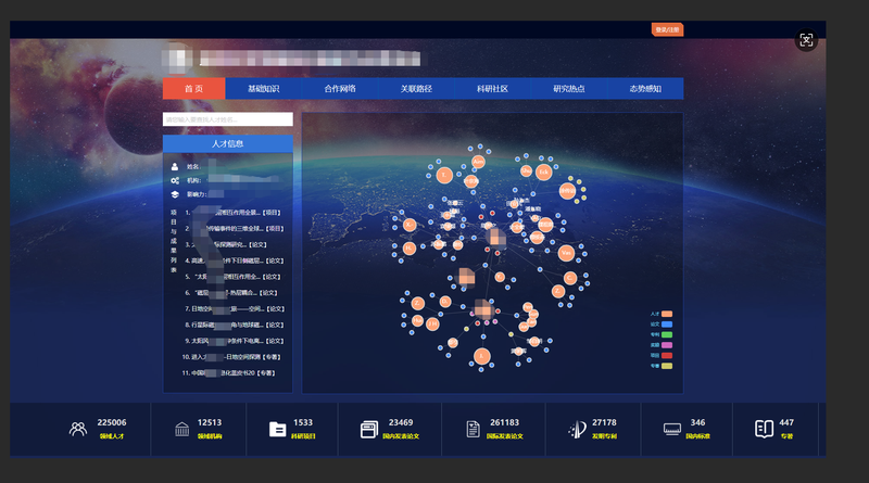 核心功能:以立体全景式网络图展示科学领域知识网络,节点涵盖项目、成果、人员、单位等数据,边代表关联关系。