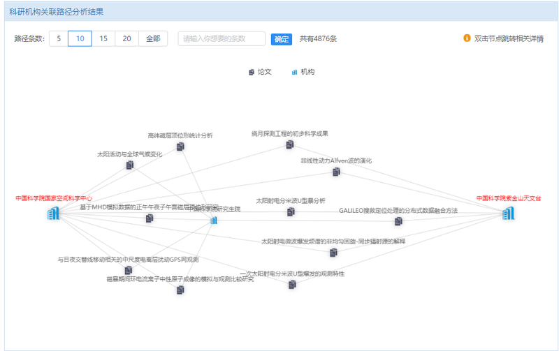 关联路径查询:查询两名科研人员或两个机构间的合作关系路径,标注路径深度与数量,支持节点 / 边的交互与高亮显示。