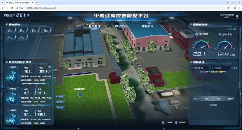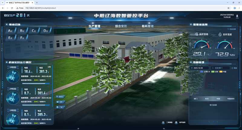 1 生产管理:厂区内部的机床,温湿度、人员的考勤的展示